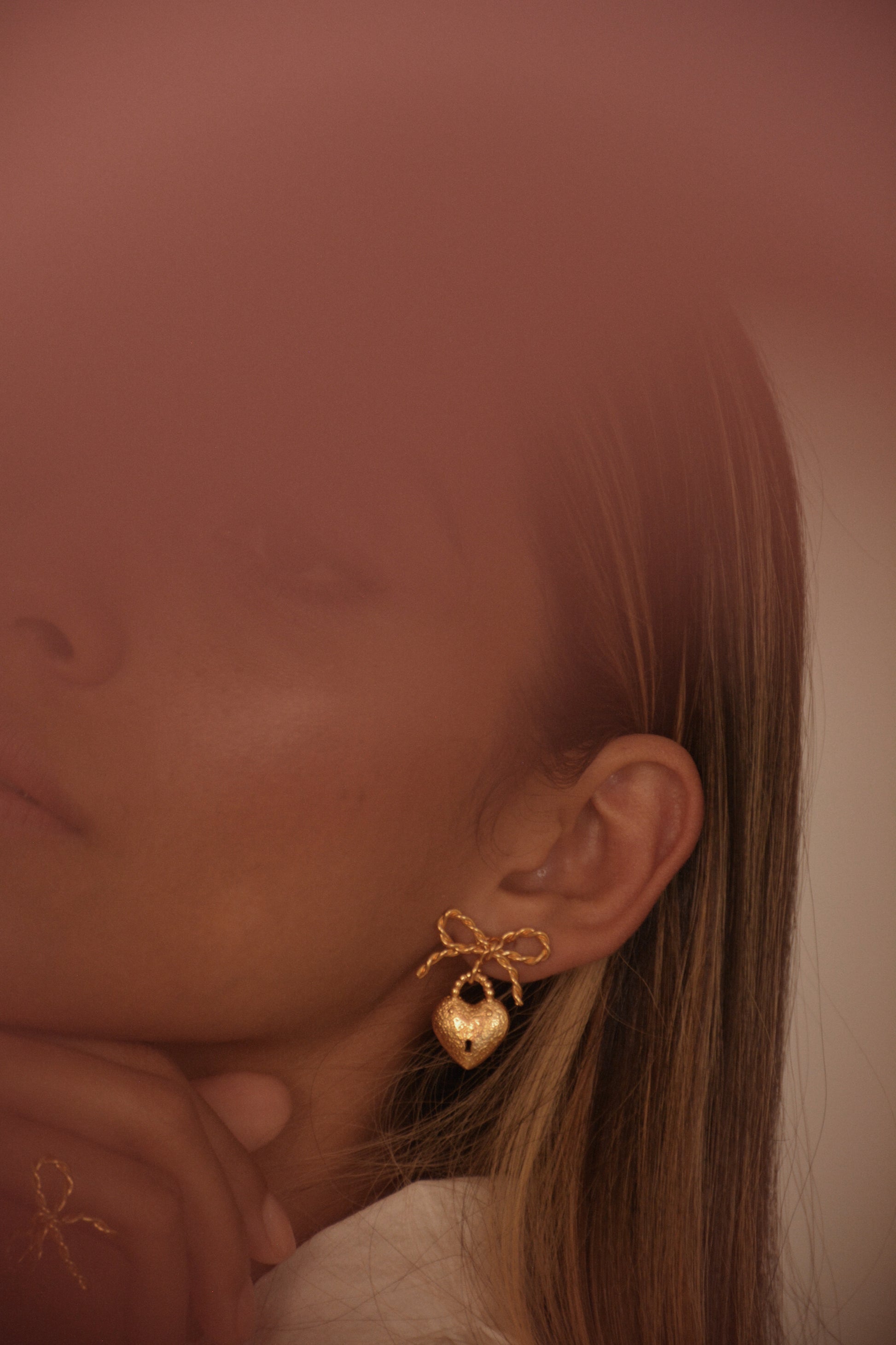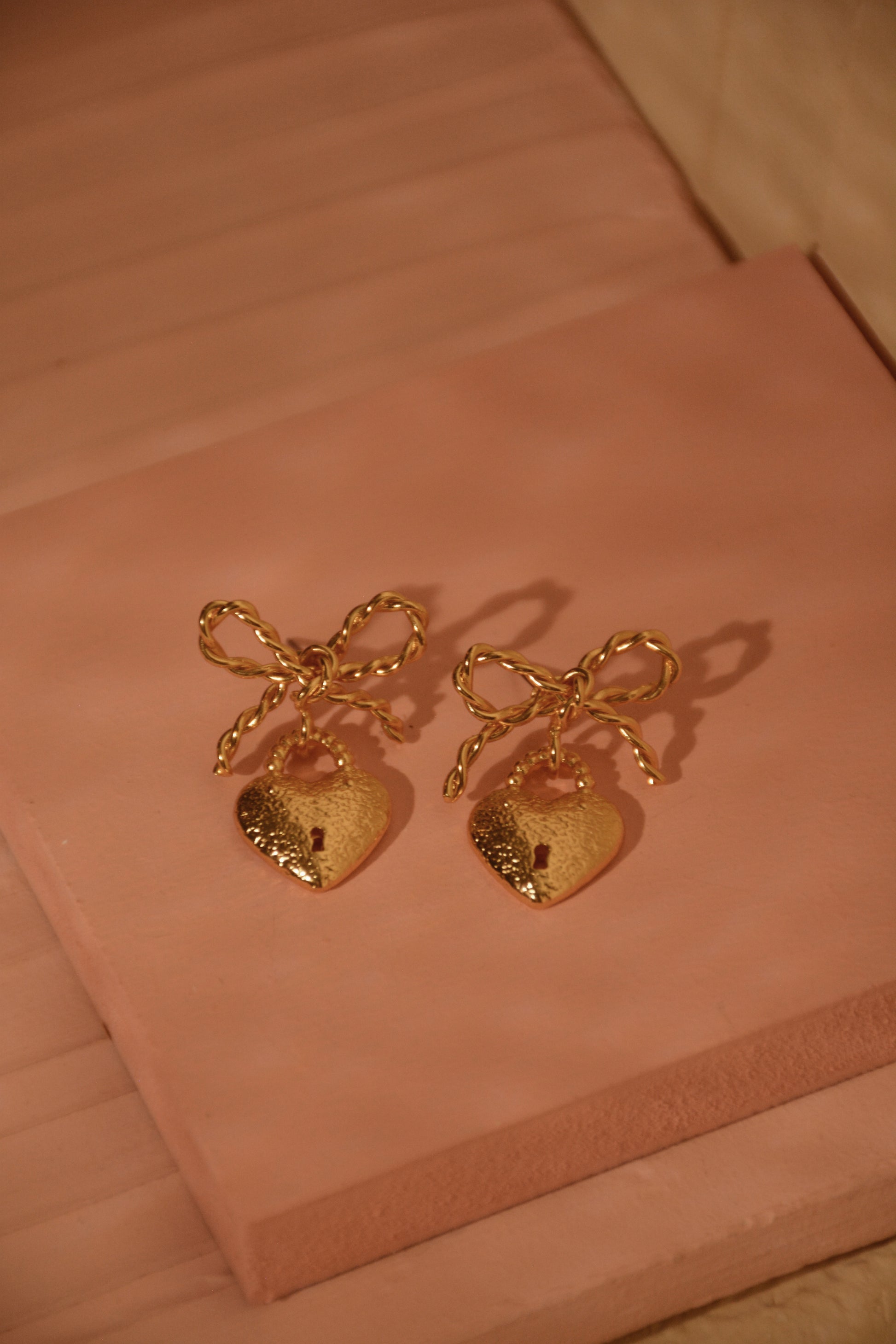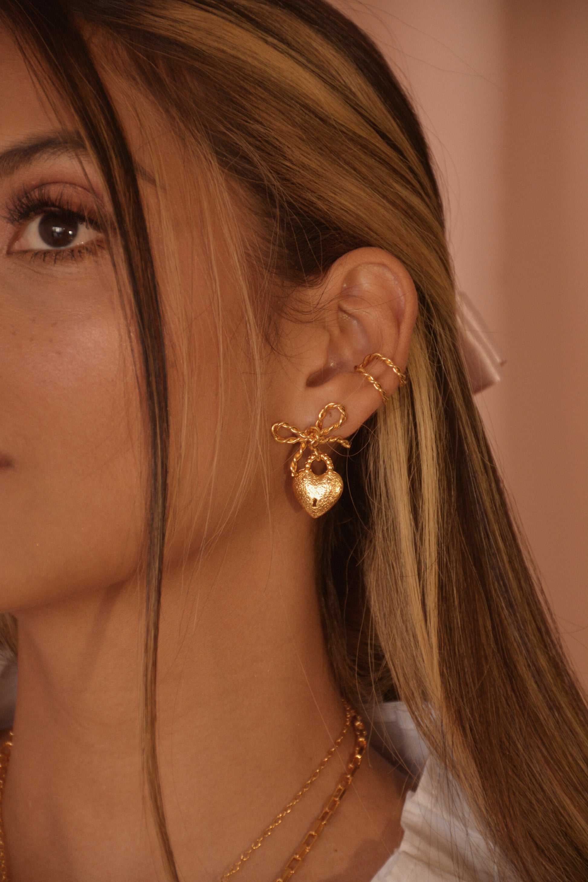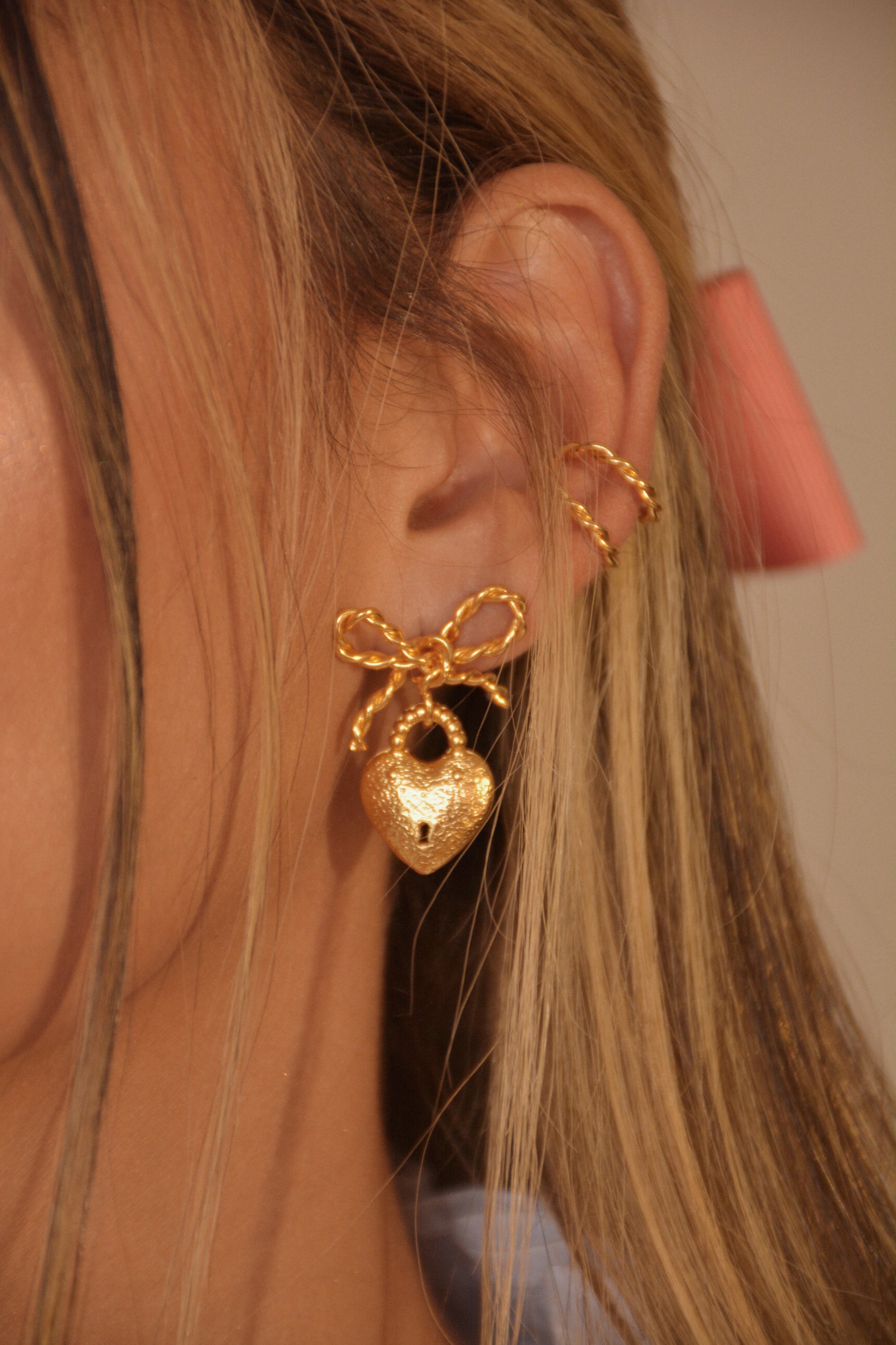 Add some charm to your ear game with our Alana bow earrings! 🎀 These twisted bow-shaped earrings come with a padlock pendant charm for a cute and chic touch. Dive into style with these playful earrings.