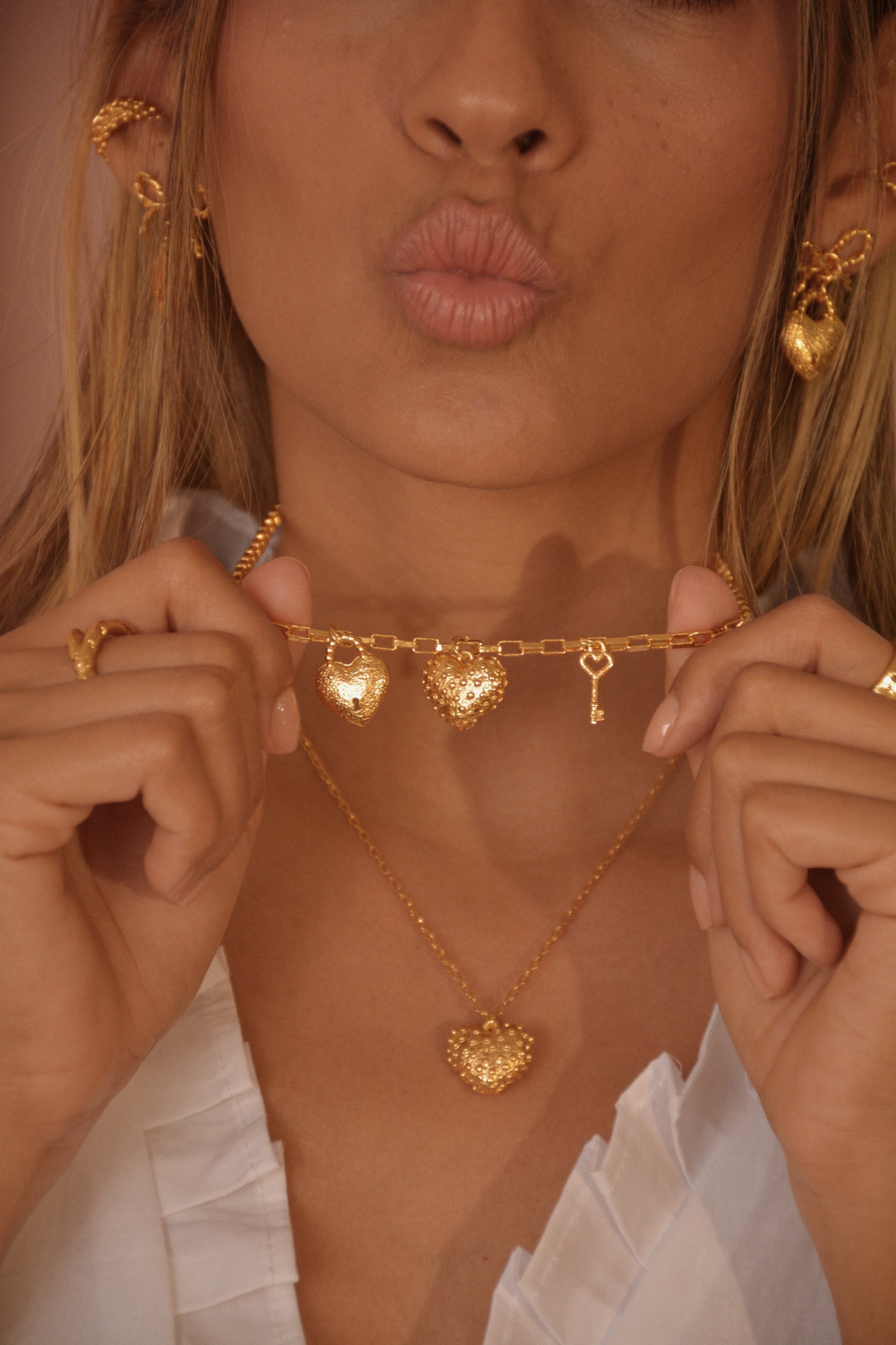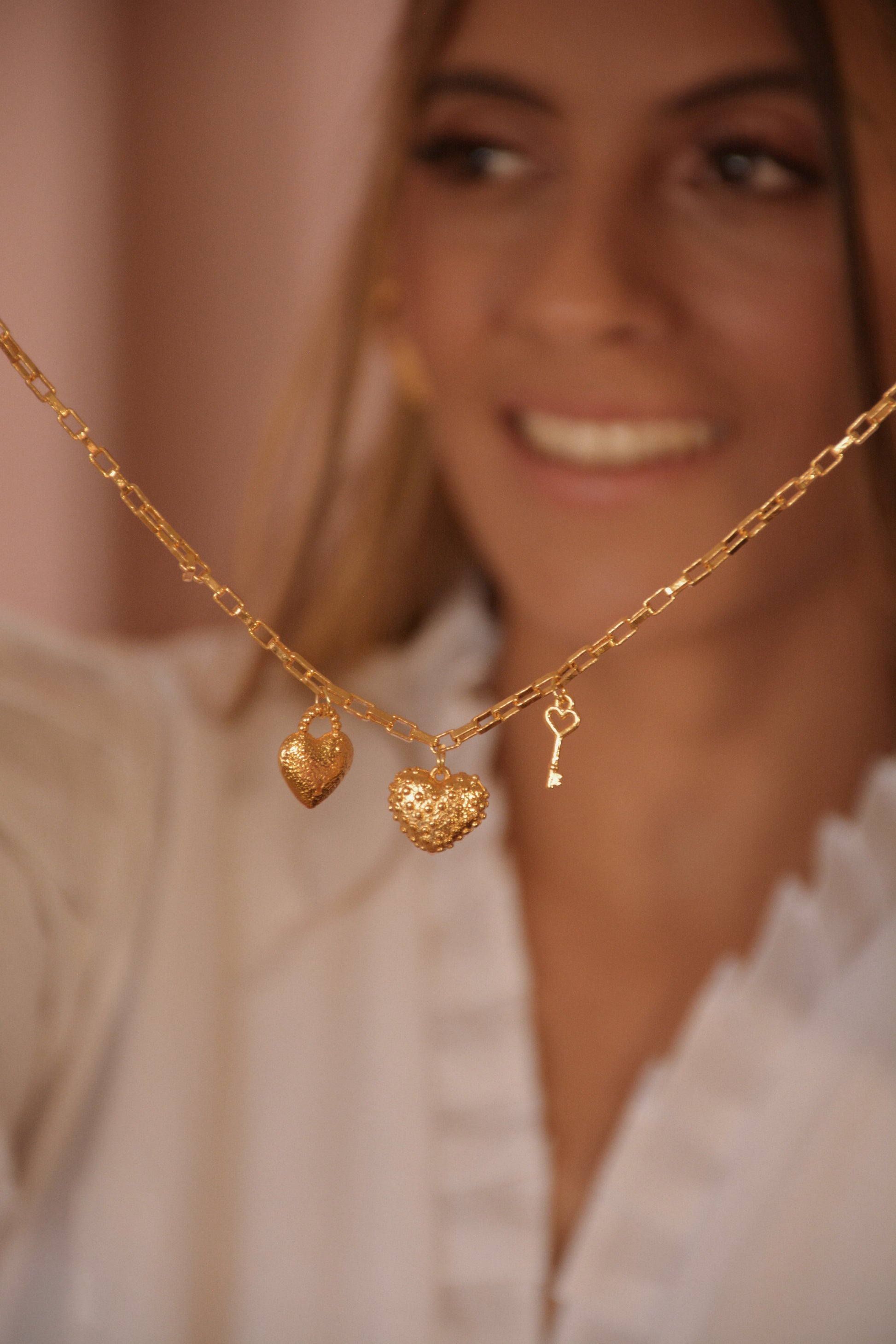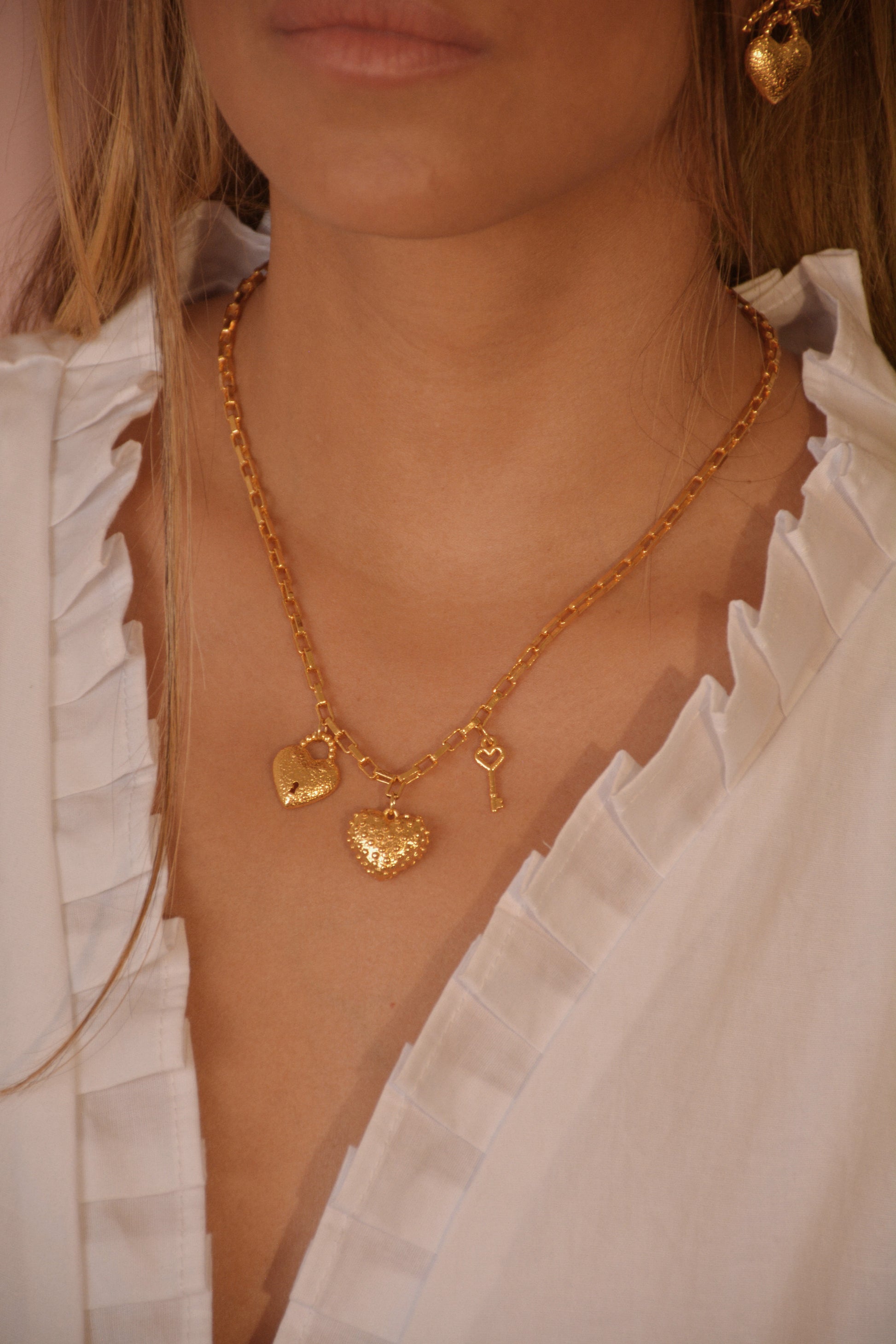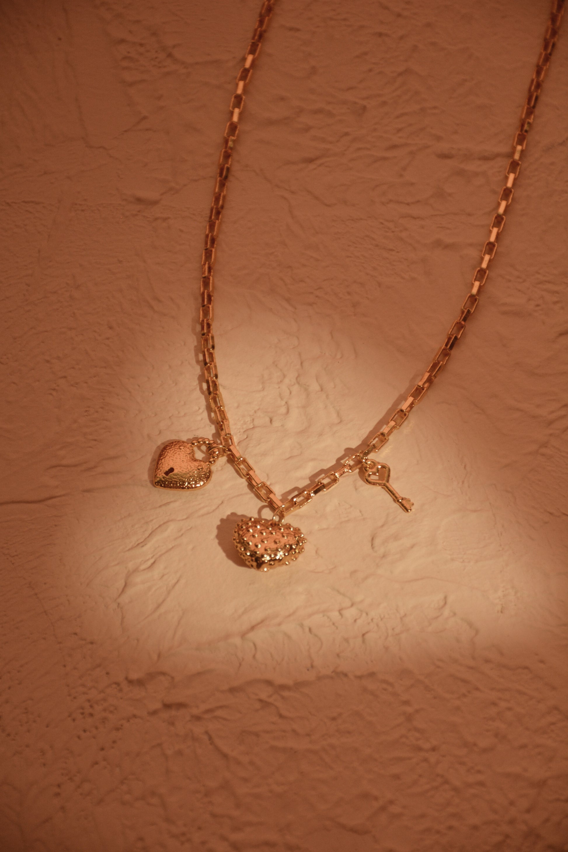 Unlock your fashion potential with the Antoniette gold necklace! Featuring a key, padlock, and heart charm, this necklace adds a cute twist to any outfit. Perfect for enhancing your look, this necklace will quickly become your new favorite accessory!
