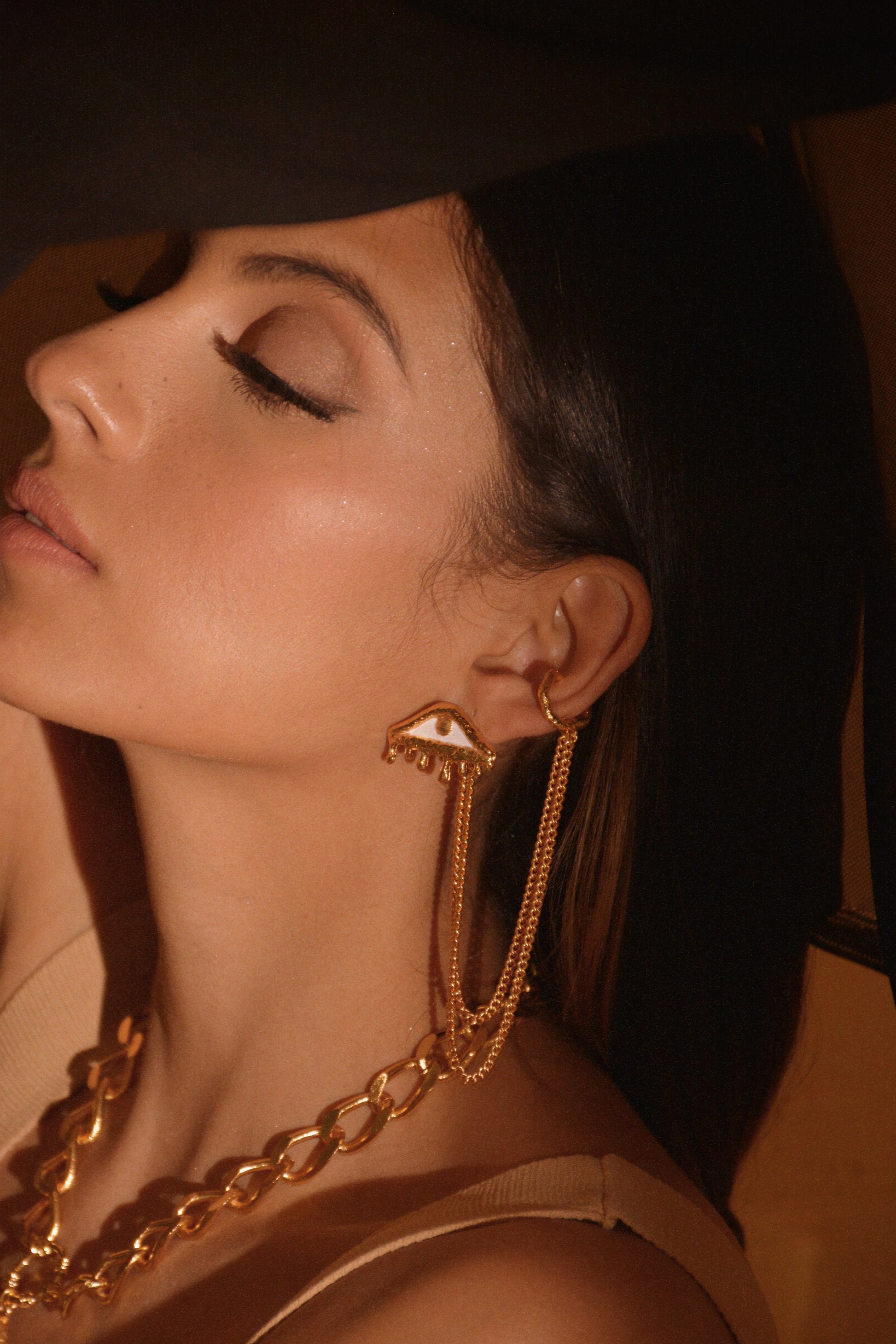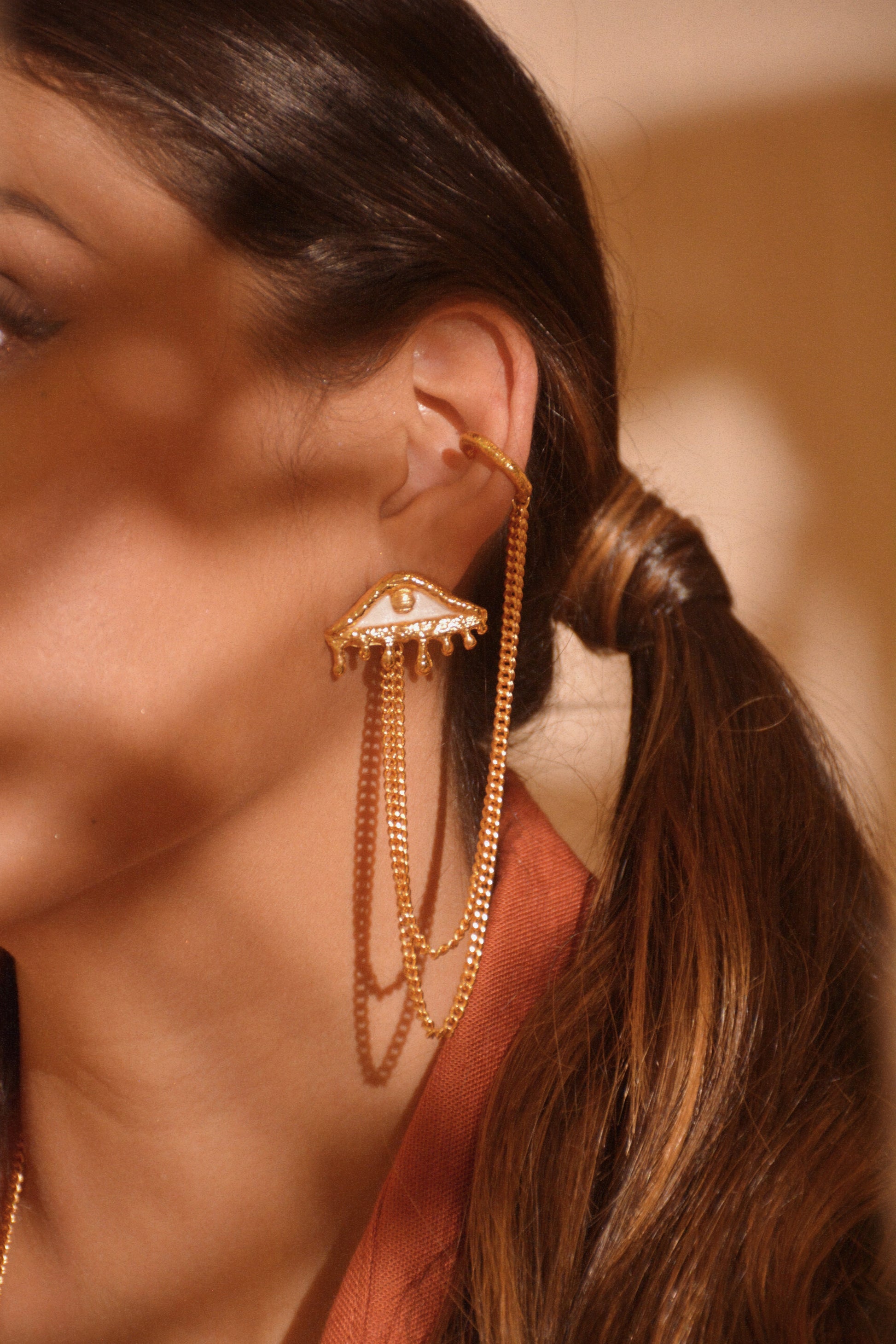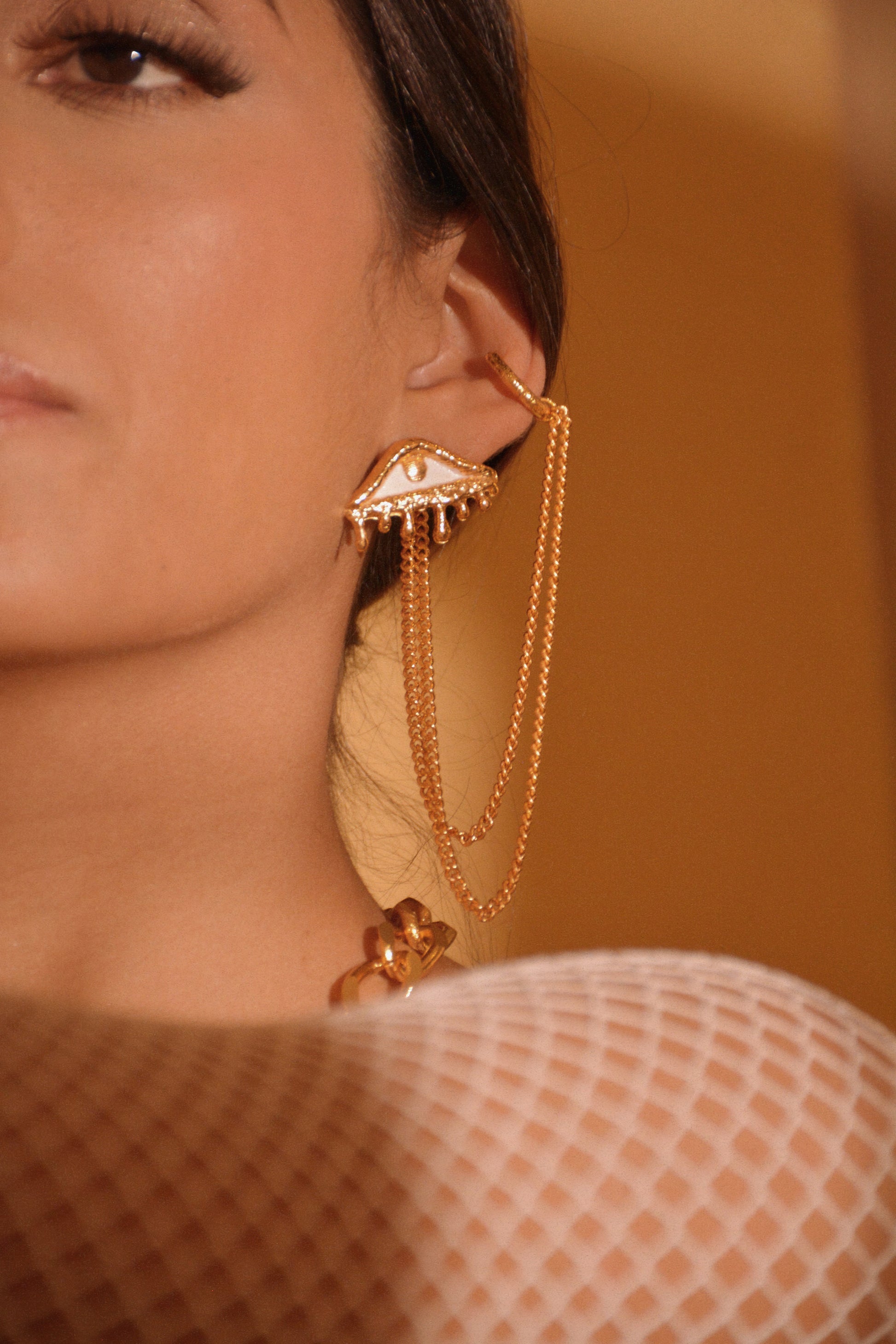 Unleash your inner fashionista with this Turkish eye earrings set complete with earrings (2) and ear cuff (1) adorned with a dangling chain. Elevate your style with a touch of exotic charm.